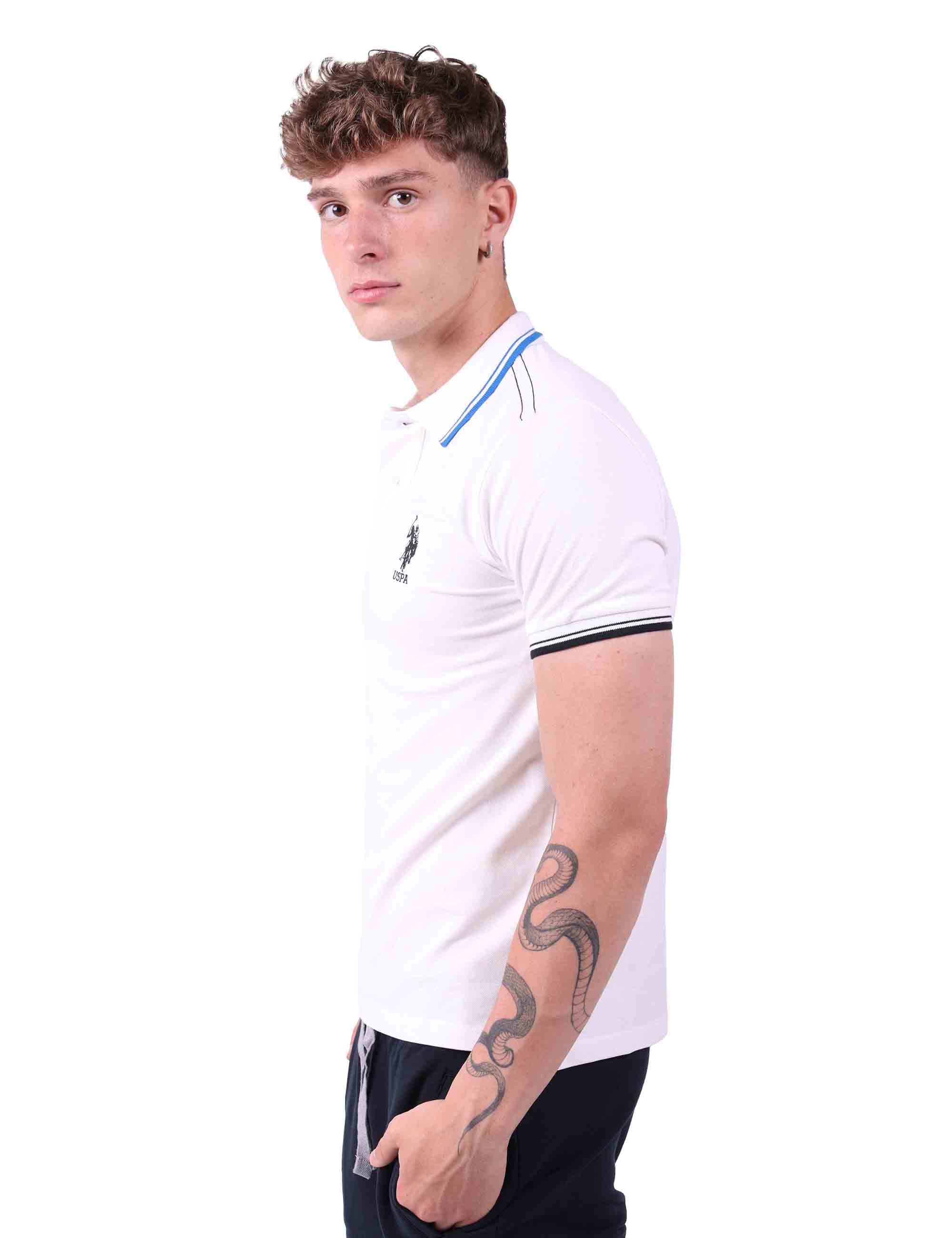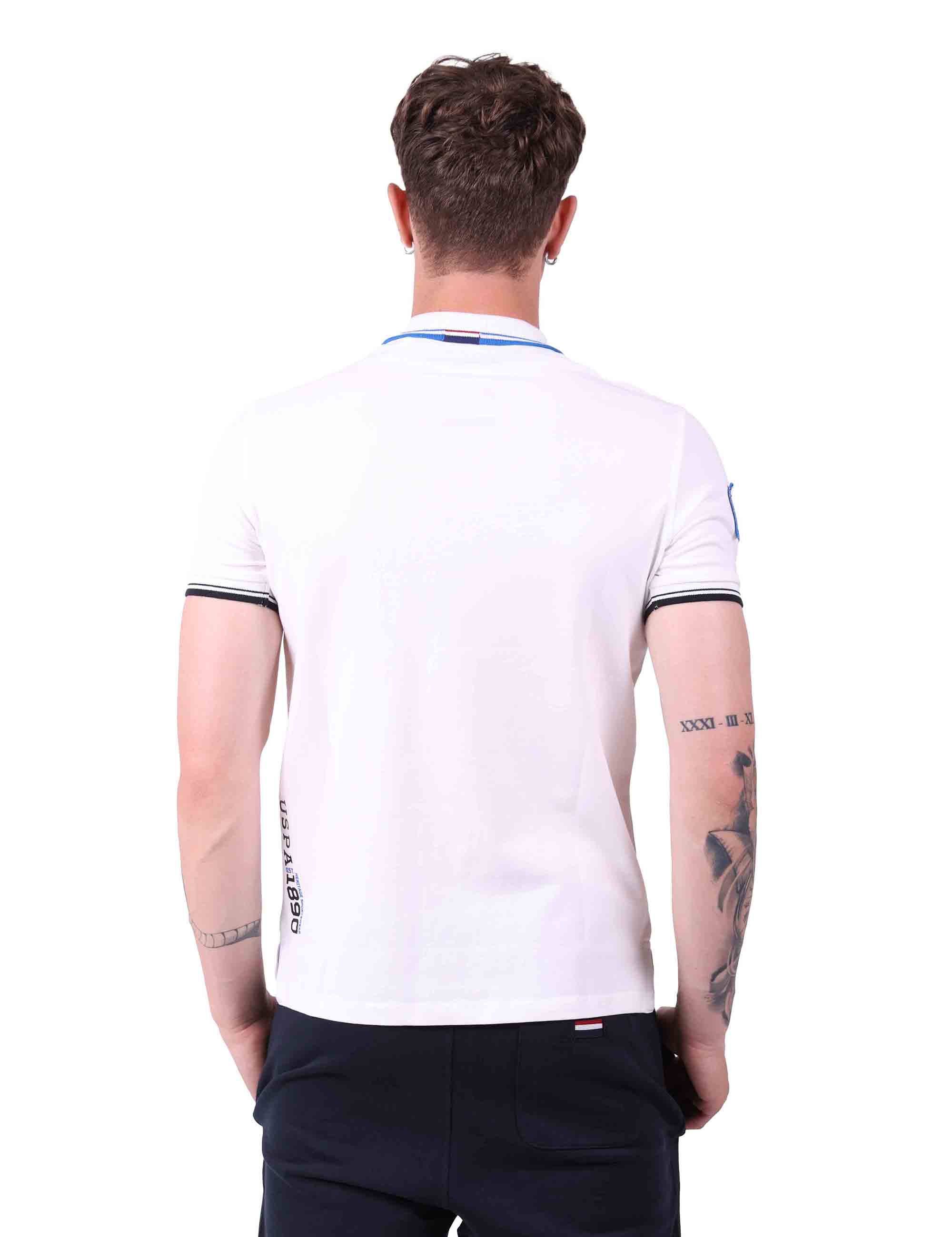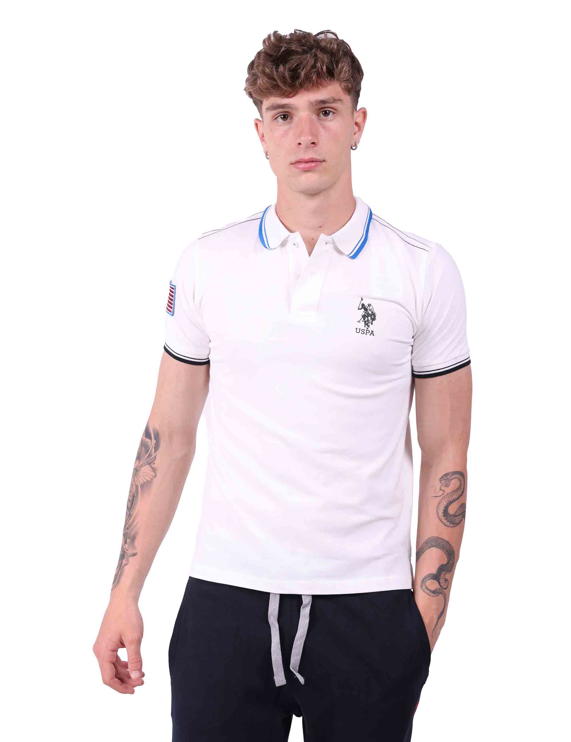 Polo a maniche corte da uomo in cotone piquet, con colletto e giromanica a coste, spacco laterale sul fondo, chiusura colletto con due bottoni e sottocolletto a contrasto colore con dettaglio riga. Il capo è contraddistinto dal ricamo del logo Double Horsemen lato cuore, accompagnato dalla scritta bandiera USA sulla manica destra.