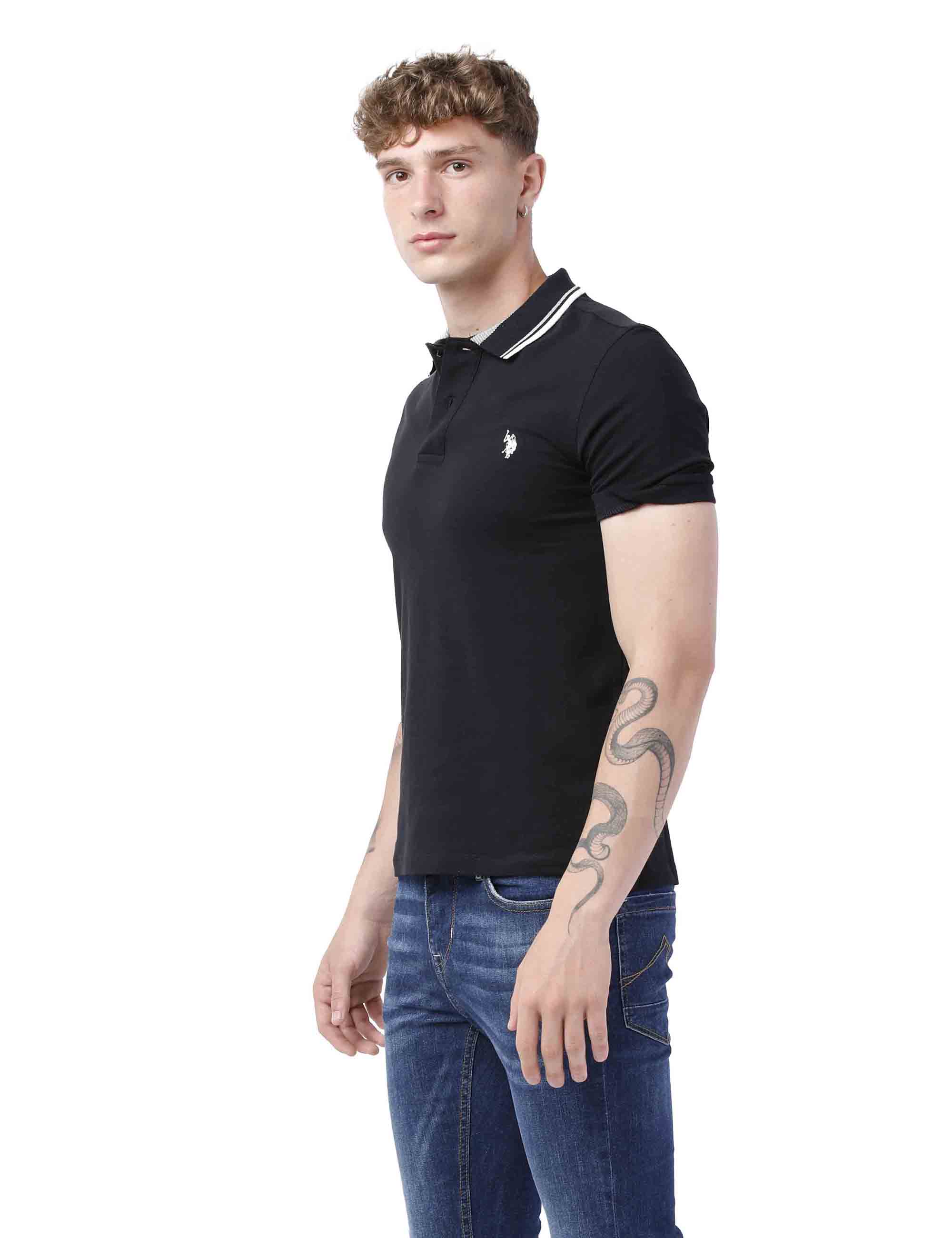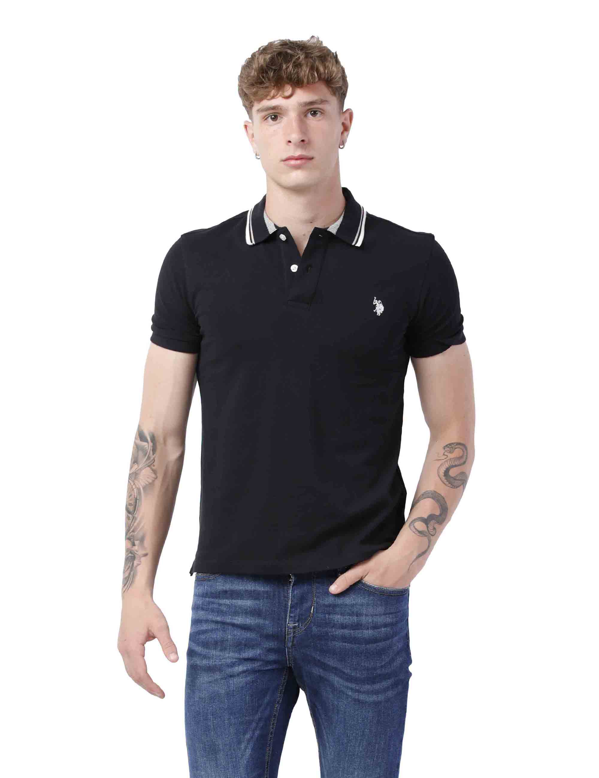 Polo a maniche corte in cotone piquet con colletto e giromanica a coste con righe colorate, chiusura due bottoni e spacchi laterali sul fondo. Il capo è contraddistinto dal ricamo colorato del logo Double Horsemen lato cuore accompagnato dalla scritta USPA